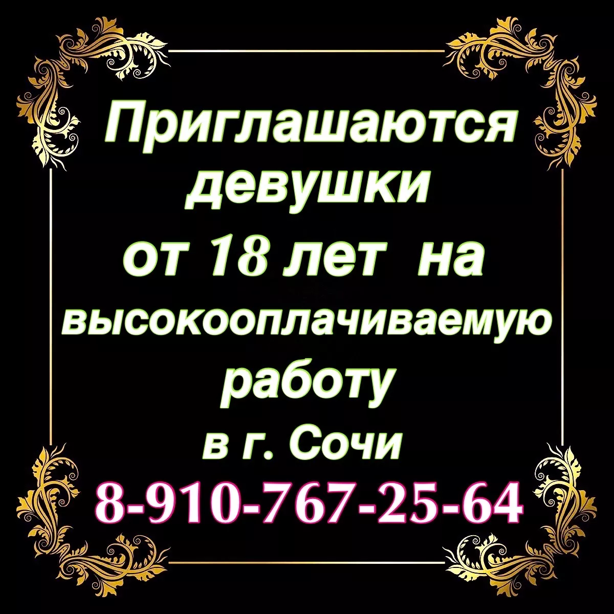 Приглашаются девушки на Высокооплачиваемую работу в г. Сочи. Конфиденциальность и безопасность гарантируются. График работы вы составляете сами, лучшие условия работы. Никаких штрафов и вычетов НЕТ!!! (В этом убедишься сама с первых дней работы). Высокая з/п (от 600000 тыс. руб. в месяц). Огромное кол-во заказов. Работаем по всем направлениям. ВЫ ВСЕГДА В ПРАВЕ ОТКАЗАТЬСЯ ОТ ЗАКАЗА. ПРИГЛАШАЕМ ДЕВУШЕК РАЗЛИЧНЫХ ТИПАЖЕЙ, КАК С ОПЫТОМ РАБОТЫ В ДАННОЙ СФЕРЕ, ТАК И БЕЗ!